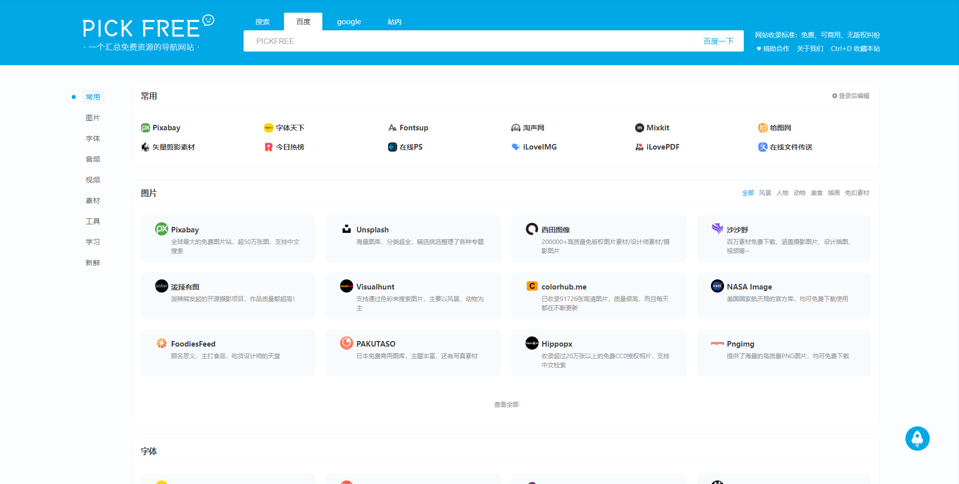 这是一个汇集免费资源的导航网站,可谓一网打尽免费的优质资源。无论你想找图片、字体、音频还是视频素材,pickfree都给你分类的明明白白,点击便自动跳转。比如pixabay,里面有超过50万张的免费图片。比如MAZWAI,里面有许多高清无水印的影片素材。