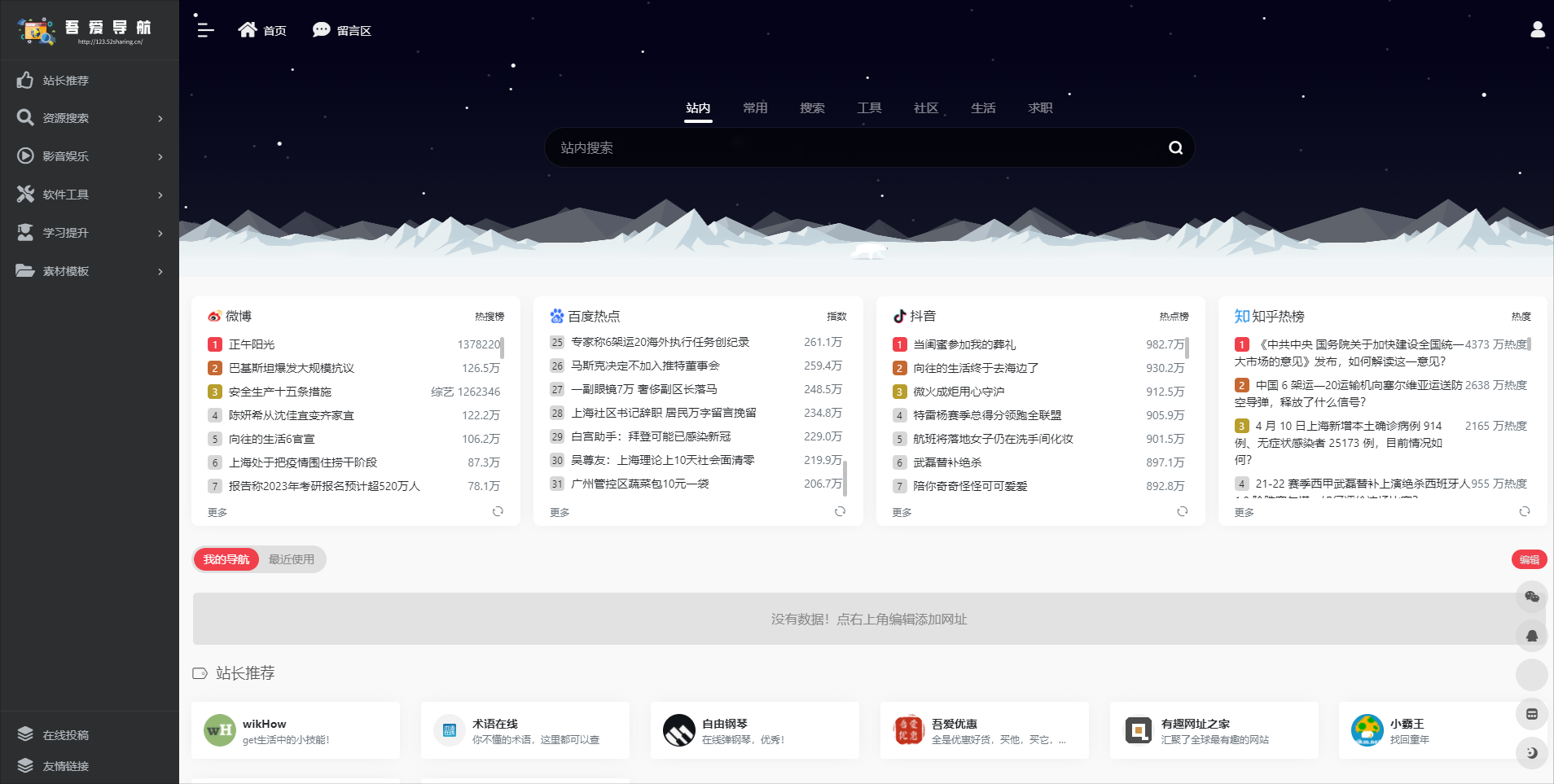 资源涵盖影视娱乐、软件工具、学习资源、素材资源等。无论是娱乐还是学习,都能找到相关的资源。而且网站内还有微博、百度、抖音、知乎的热点榜,让人一目了然当下最热门的信息。