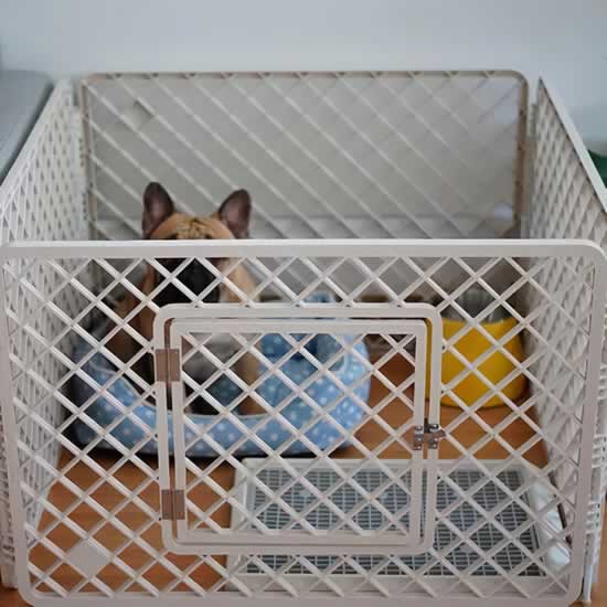 1、用围栏缩小狗狗的活动范围,将这块范围分为放食盆水盆的进食区,放狗窝或航空箱的休息区,放狗厕所的排泄区这三个间隔较小的区域。