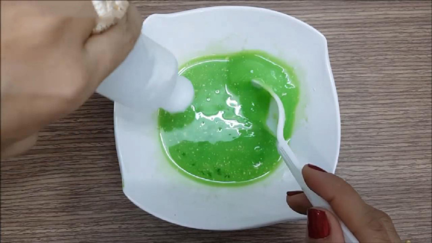 加入胶水后,我们加入一些儿童牙膏,牙膏可以起到让史莱经蓬松和润滑的作用,牙膏本身的颜色还可以起到调色的作用。