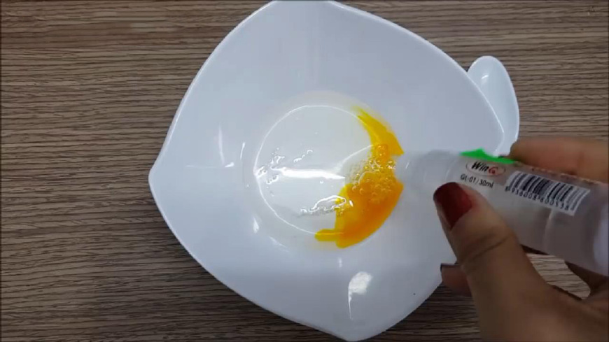 在容器中加入透明胶水和颜料,这次我们要做一个蛋黄色的史莱姆。