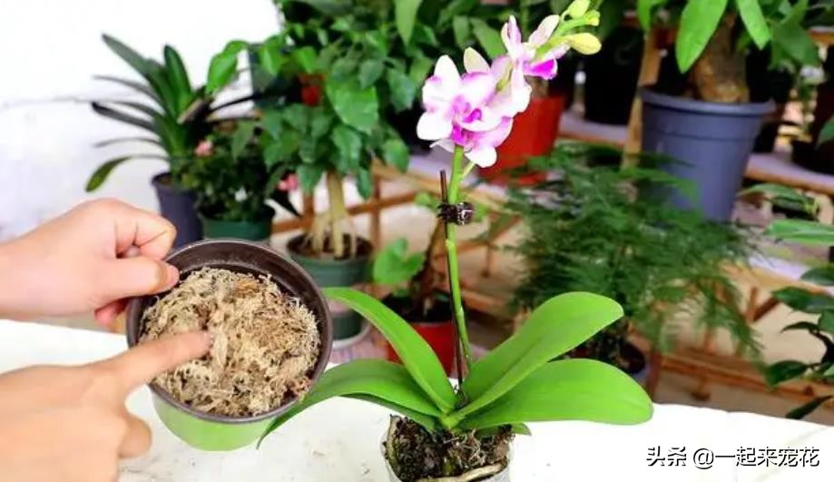 第二步,开过一次花之后,蝴蝶兰的盆土里几乎没有什么养分了,对于蝴蝶兰的生长很不利,这个时候浇水之后,很容易出现腐烂的情况,所以我们可以重新换盆换土,将种球放在疏松透气、养分充足的土壤里,并且铺上一些水苔,水苔保水性好,并且透气性也不错,对于蝴蝶兰的生长是有帮助的。