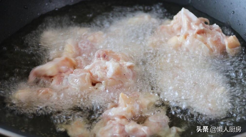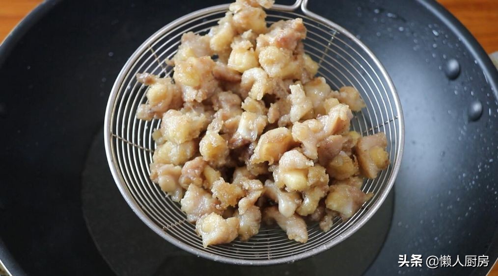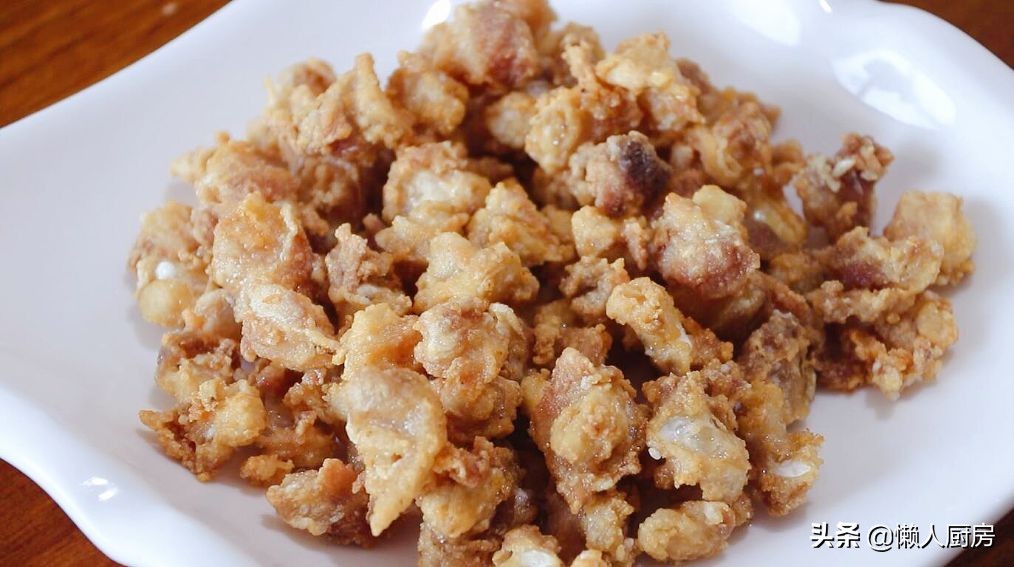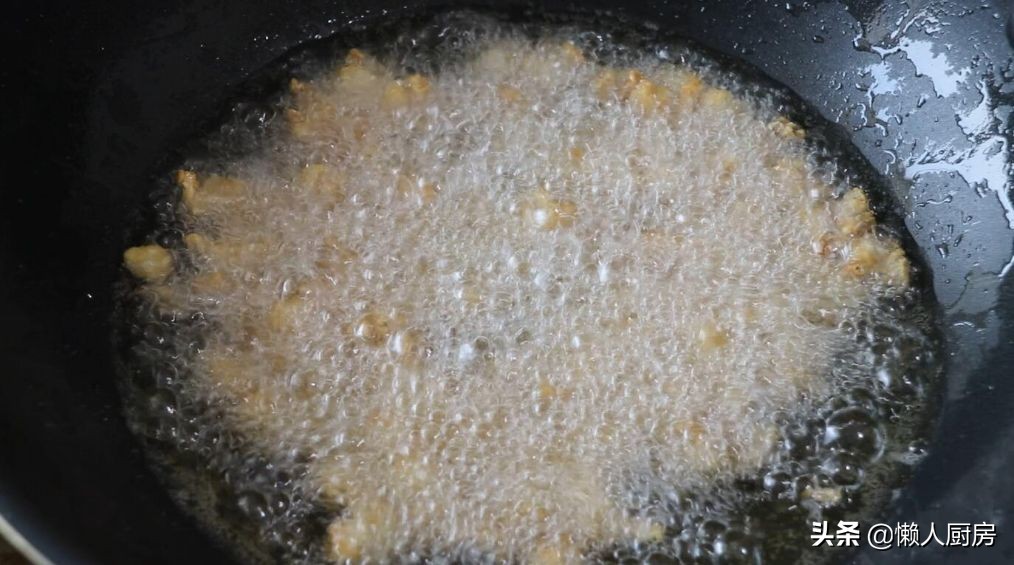 大火炸到鸡脆骨起壳儿,捞出鸡软骨,继续加热。