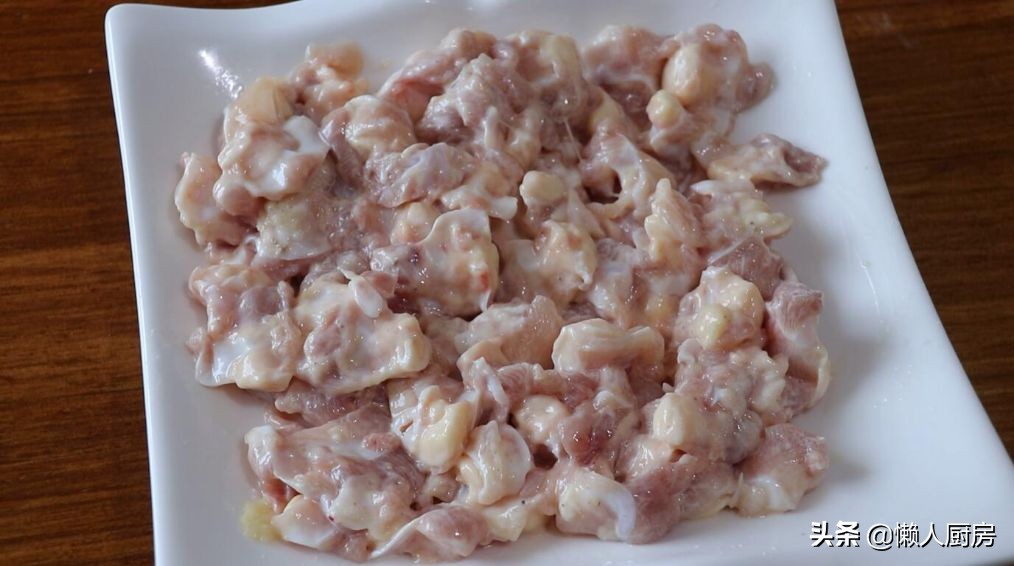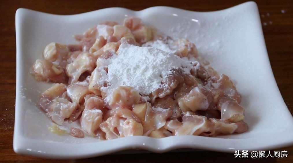 再往腌制好的鸡软骨里面,加一小勺量的干淀粉,用手抓匀,使每一粒鸡软骨上面都裹上一层淀粉糊。