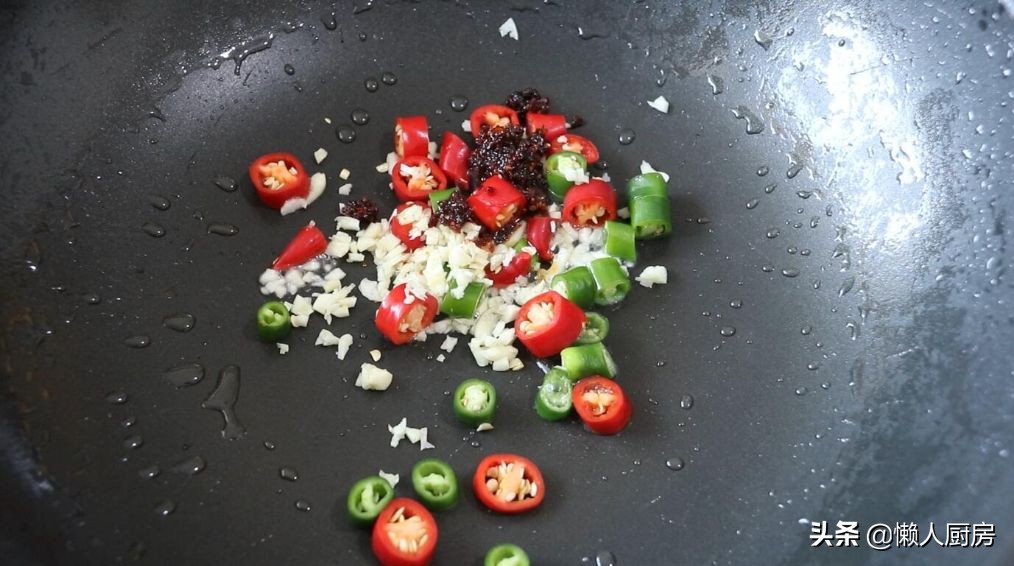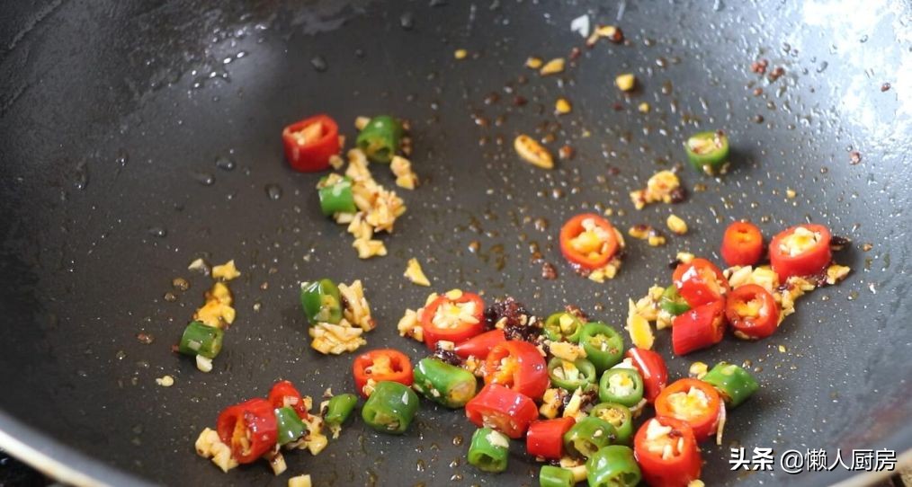 倒掉锅内多余的油,留底油,下青红线椒圈和蒜末炒香,加一点点香辣酱炒匀。