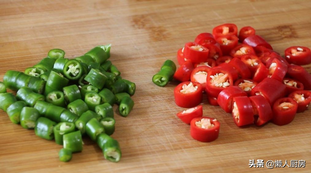 青红线椒洗净,切成小圈,大蒜切末备用。