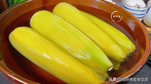 第三步:等捞出的玉米放凉后,然后把玉米放入到凉白开中浸泡3分钟,接着再把玉米表面的水完全沥干。