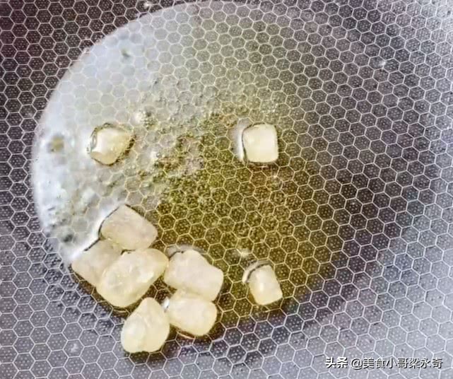第三步,另起锅倒入少许食用油,油温烧至5成热下入冰糖,开小火慢炒,直到将冰糖炒至枣红色时下入鸡爪,翻炒至鸡爪上色。然后倒入适量的开水,水的用量刚好没过食材即可。