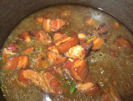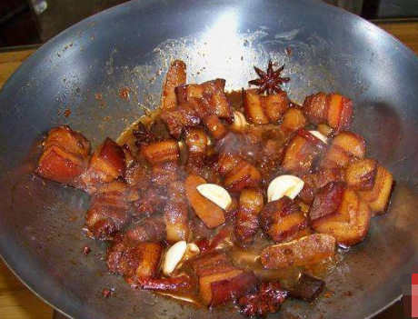 第五步,待看到锅中的水不多的时候,将调好的糖醋汁倒入锅中,加上盖子,转至大火,煮开后,转至小火,继续炖煮,直到将五花肉炖煮至软烂的时候,转大火,收浓汤汁,加上盐调味即可。