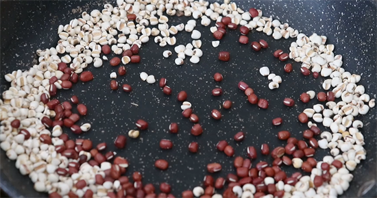 3、用小火慢慢翻炒薏米可以去除它的寒性使我们吃起来更加安全。薏米翻炒三分钟就可以了,时间到了之后咱们将红豆也放进去翻炒,因为红豆不容易煮烂翻炒一下更容易煮熟,也能够激发出它里面的营养物质。