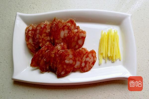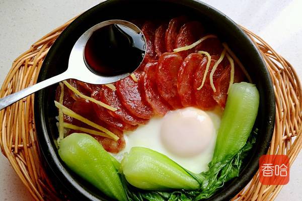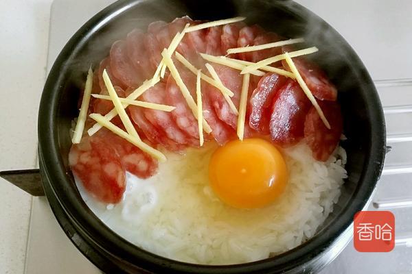 9.放入腊肠,姜丝,鸡蛋,盖上盖,直到米饭成熟,关火后让米饭再焖一会。