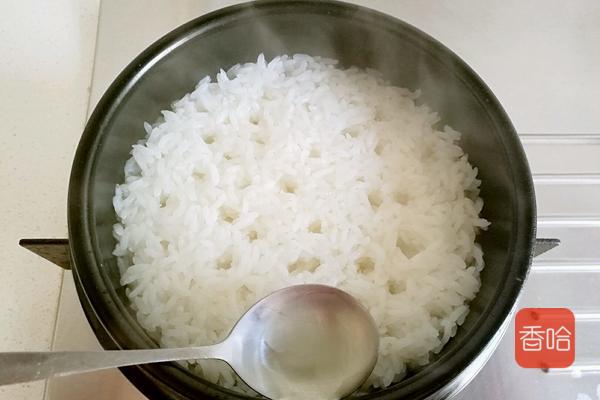 7.转小火煲至米饭收干水,呈蜂窝状态。