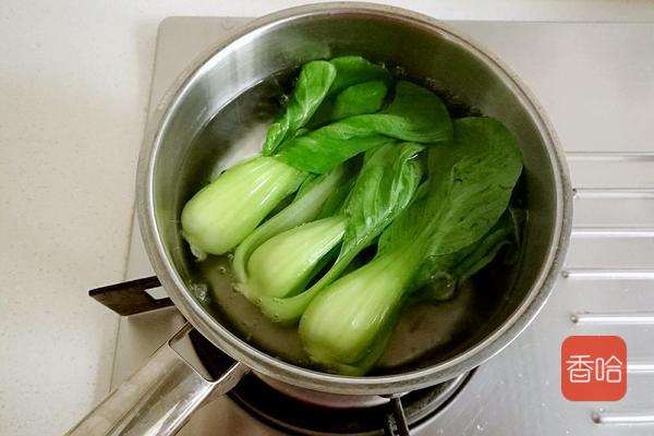 3.锅中水烧开,放少许盐,几滴油下菜心焯水备用。