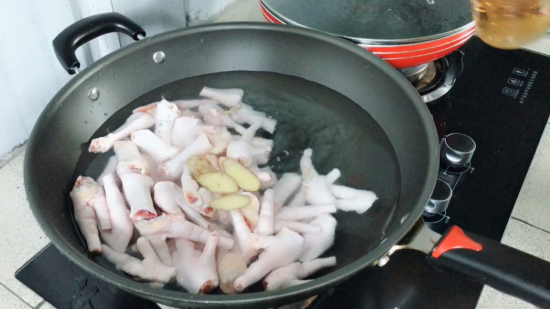第二步:加入大量的清水,鸡爪冷水下锅,加入姜片,加入2汤匙料酒,加入1汤匙白醋,然后大火煮沸,煮沸后撇去,再煮一会,把鸡爪煮熟!