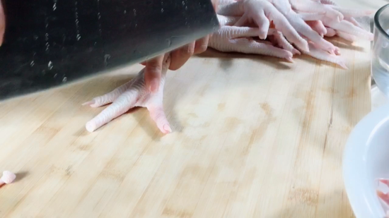 第一步:先将柠檬切成薄片备用,将生姜切片,大蒜拍扁剁碎,香菜切碎,小葱切花,小米椒切圈备用!接着把鸡爪剁去指甲,再一分为三!
