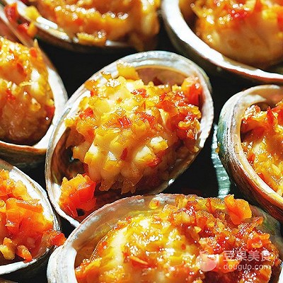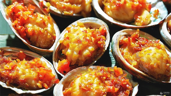 9、将烧好的食材移入鲍鱼壳,表面放上炒好的鲜红椒,拍照,开吃!