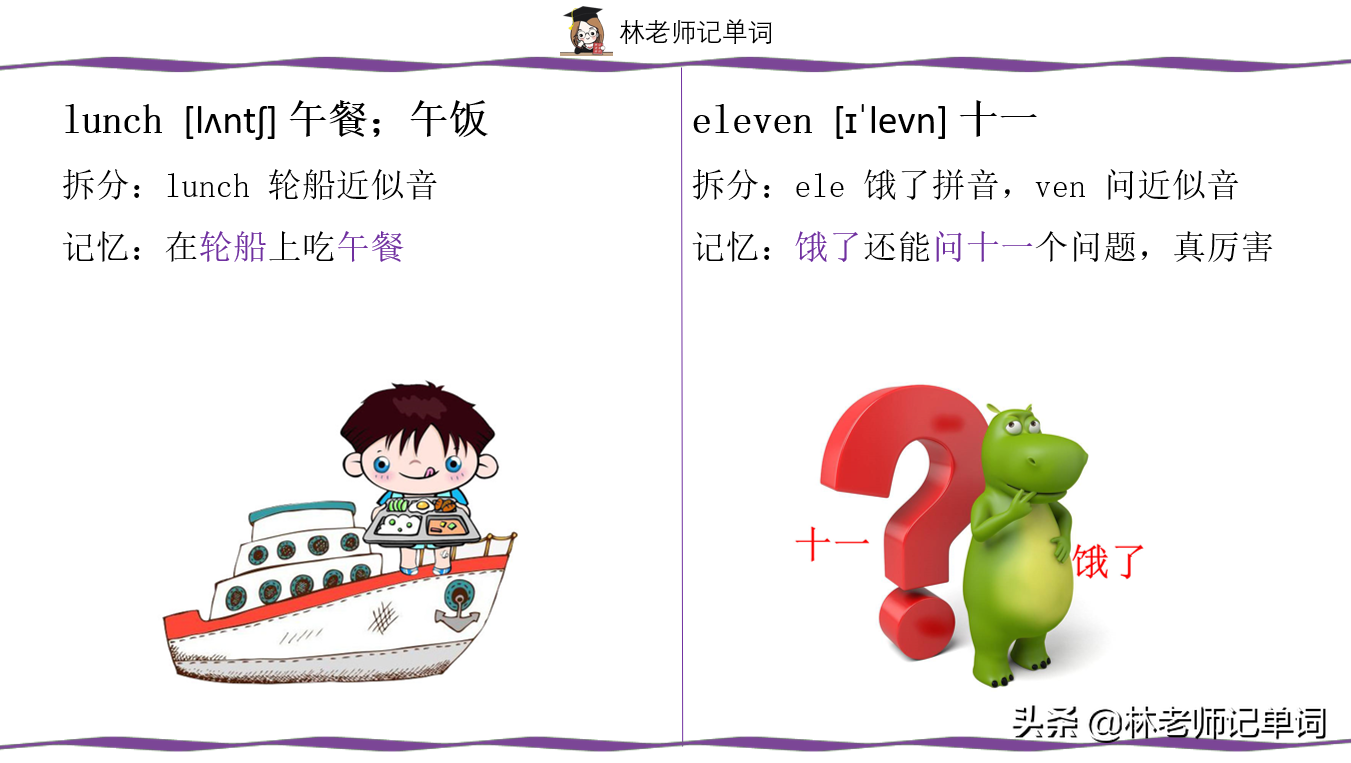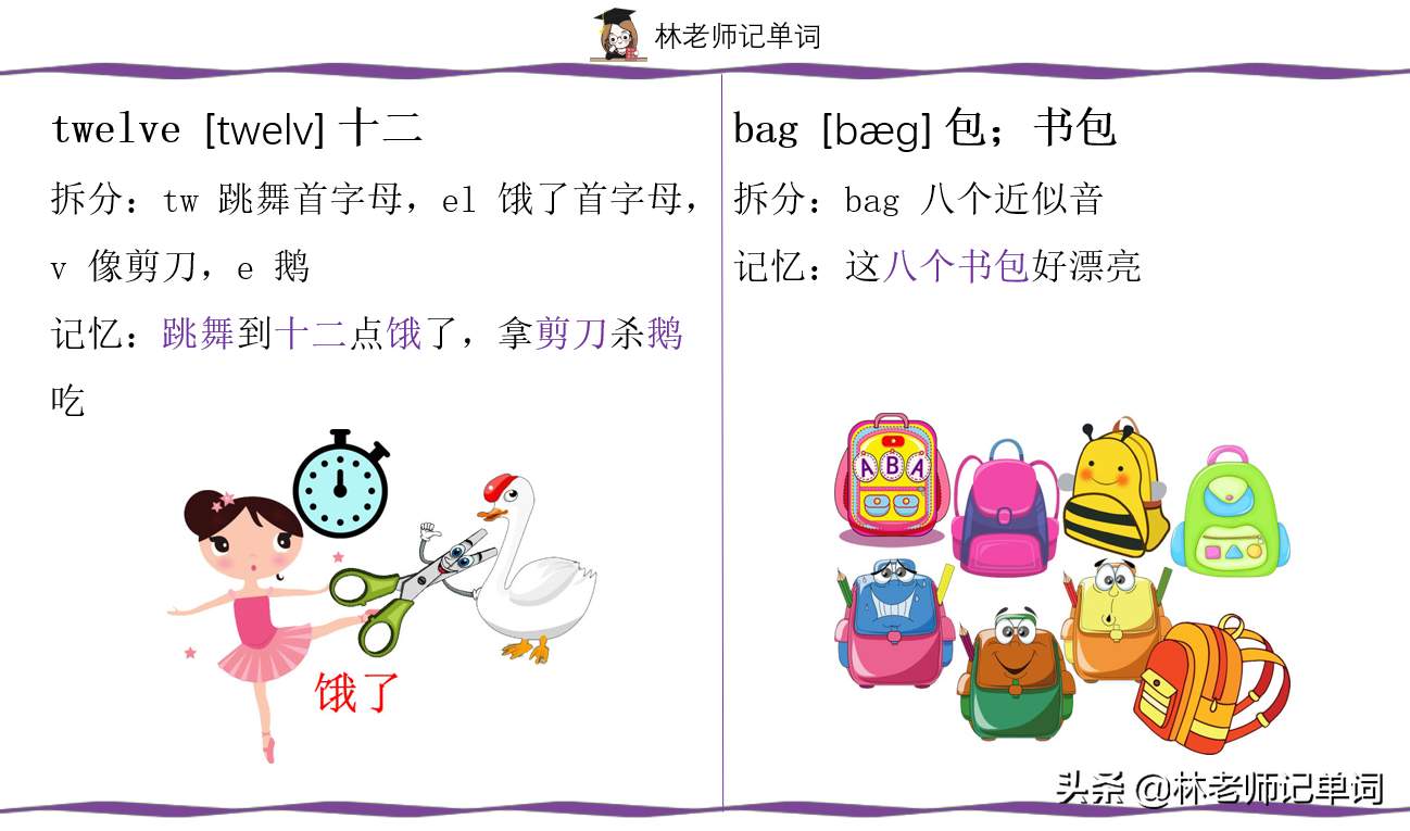 那么除了11、12、13、15、20这三个单词没有规律,其它14-19都是规则变化单词,也就是在原数字单词four、six、seven、nine后面加上teen。接下来我们看看如何记忆这些单词吧: