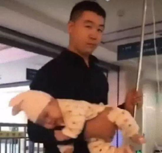 这位爸爸在带孩子打点滴的时候,一手托举支撑杆,一手抱着孩子。