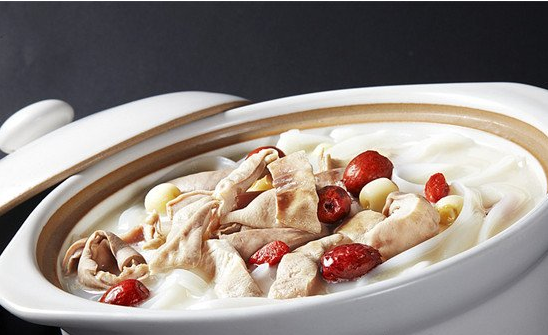 4、转用文火煮酥后,放入莲子(莲汁),加入精盐、味精、绍酒调味,撒上葱花即可。