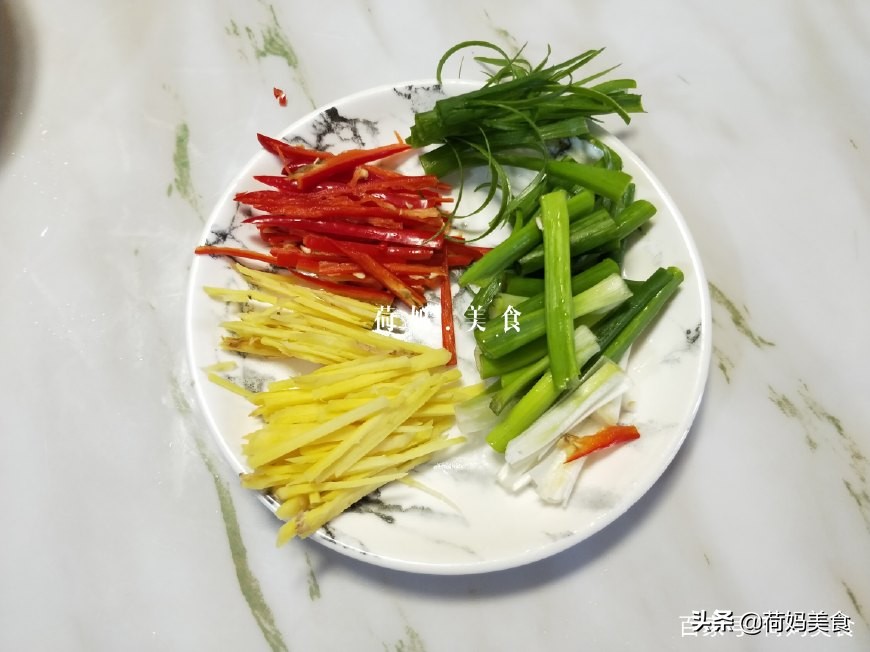 首先将冷冻的比目鱼取出,自然解冻。接着将姜切丝,葱切段,部分葱叶切丝,不辣的红椒切丝备用