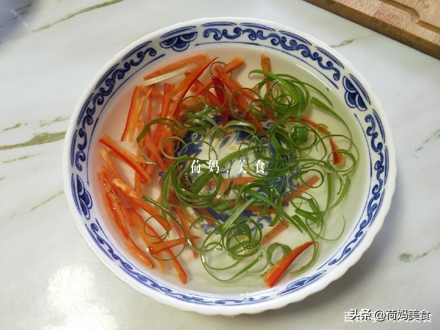 4、蒸鱼的时间将葱丝和辣椒丝放入水中,浸泡几分钟,发卷就捞出来控水