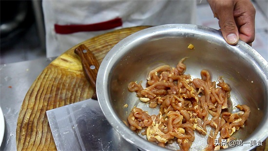 2.里脊肉一块,先切成片,再切成丝,把肉丝放入盘中,加入食盐,胡椒粉,料酒,滴几滴老抽调底色,快速的搅拌均匀,再加入植物油搅拌均匀,用植物油锁住肉丝的水分,口感更为鲜嫩。