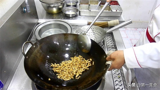 5.下面,我们把肉丝滑一下油,锅里倒入植物油,把油烧热,充分滑锅以后,倒出热油,加入凉油,再倒入肉丝,快速搅动免得粘连,把肉丝炒变色以后,倒在漏勺上控油。