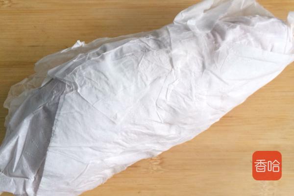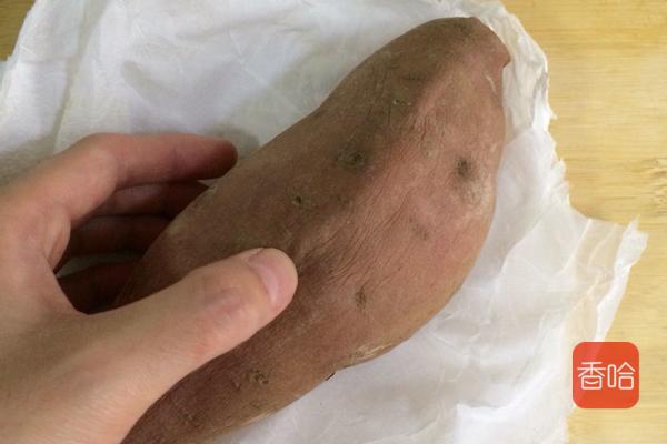 3.用餐巾纸把红薯包裹起来,多包几张,包裹严实了。