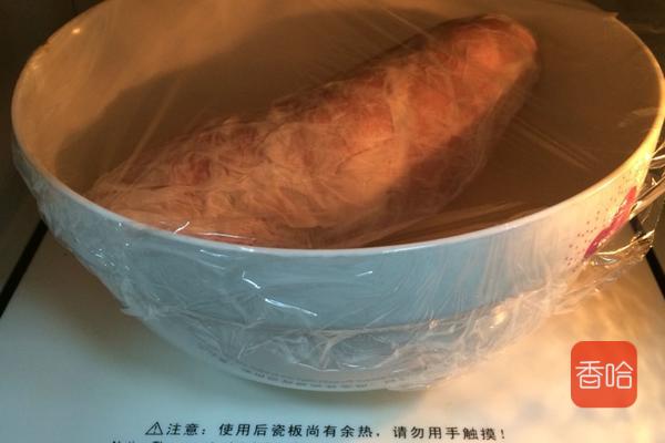 5.把红薯放入大碗内,覆盖好保鲜膜。