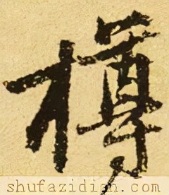 右部“尊”字上收下展,不要写宽。上面“酋” 字紧凑抗肩:上面点、撇左低右高,注意与左部的相对位置;横画露锋起笔,大抗肩,勿重;下面“囗”框稍偏左:左竖斜切起笔,向下稍左斜,勿重;横折虚接起笔,横画渐重,抗肩与上面协调,到位后顿笔、略内擫写竖,稍重;里面两小竖整体稍偏左,相抱呼应,勿重、勿长;两小横虚接起笔,抗肩稍大,布白均匀;底横实接两竖,略呈俯视,与两小横等距平行。中间长横托上覆下,可以从视觉上拉矮整字:起笔左探,抗肩与上面协调,稍呈俯势,收笔稍下拉。下面“寸”字上收下展:横画靠近长横,稍重,与长横平行,注意长度;竖钩半虚接起笔,注意位置,竖身略右斜,挺拔劲健,力撑整字;末点靠左,不要写重。
