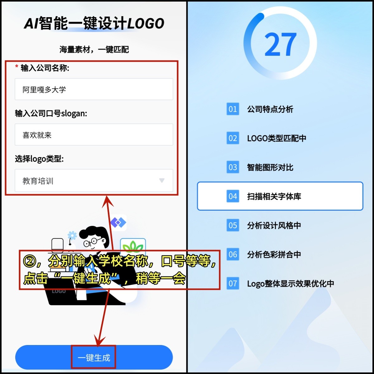 步骤二,设计页需要在文本框中输入学校的名称和校训等等,点击“一键生成”后,大家需要稍等一会logo的生成。