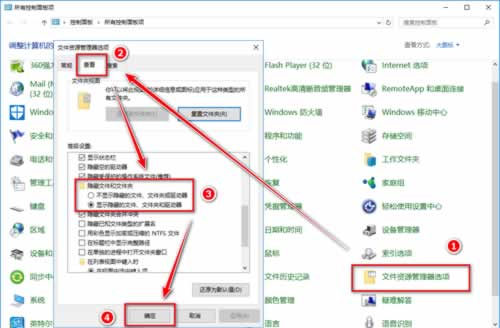 在文件资源管理器选项窗口,“查看”选项卡中,在“高级设置”中找到“不显示隐藏的文件、文件夹或驱动器”,点击选中前面的小圆圈后,点击“确定”按钮保存设置。