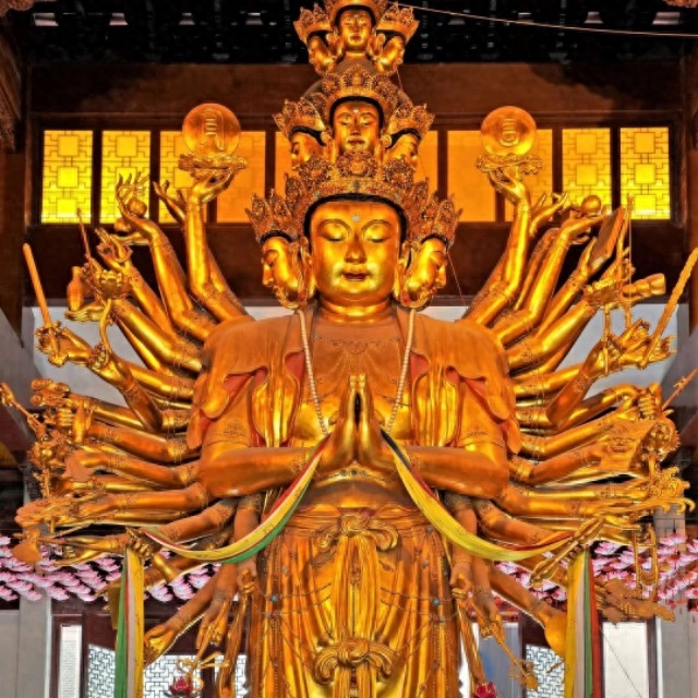 第一位是观世音。唐代避帝讳又称[观音]。据《妙法莲花经》说:观世音是大慈大悲的菩萨,众生受苦受难时,他[即时观其音声]前往拯救。众信徒给他的美称是[大慈大悲救苦救难观世音菩萨]。有的寺中观音菩萨是女身,有的寺中还有千手观音,这是怎么回事呢?一是佛经上说观音能现三十三身,其中一些是女身;二是南北朝时北魏冯太后笃信佛教,她要打破[女身不能成佛]的说法,这样就出现了女观世音的塑像。以后又有人把女观音附会为楚庄王的三女儿妙善,她执意出家,庄王大怒,后庄王得重病,前两个女儿皆不愿以身救他,三女儿妙善化为仙长,断手剜眼献给庄王。庄王服用此药后病愈,得知真情后,吁叩天地,请上天让女儿长出手眼,结果一下子长出了千手千眼,并成了菩萨。而佛教教义上讲,观音听了说法后,立大誓要[利益安乐一切众生],于是长出了千手千眼。千手表示遍护人生,千眼表示遍观世间,寓大慈大悲,法力无边的意思。[千手观音]像一般用正常人物上身左右各出二十只手,手上各有一眼,共计四十只手、四十只眼,再配了三界中二十五种生存环境,于是四十只手眼有二十五种循环,即为千手千眼。