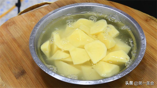 2.土豆一个,削去外皮,切成块,放入盆中加入清水浸泡(加入清水浸泡,防止土豆块氧化变黑)。
