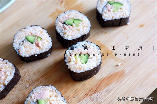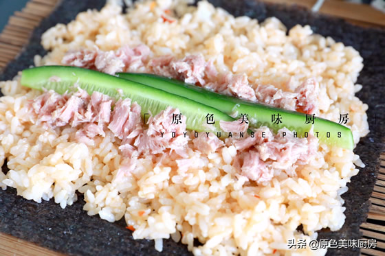5.在中间铺上黄瓜条,铺上金枪鱼。