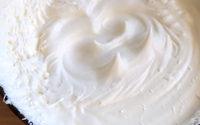 2、打发淡奶油的时候,先低速打发出泡泡,再高速打发至定型起尖角