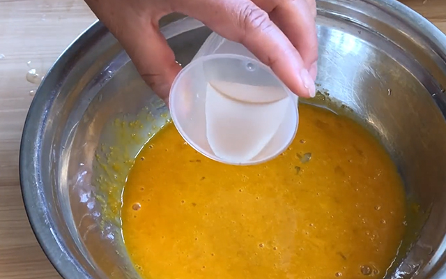 第二步:蛋黄碗里加入20克白糖,搅均匀。再加入15毫升清水,继续搅匀。滴入两滴白醋或者柠檬汁去腥