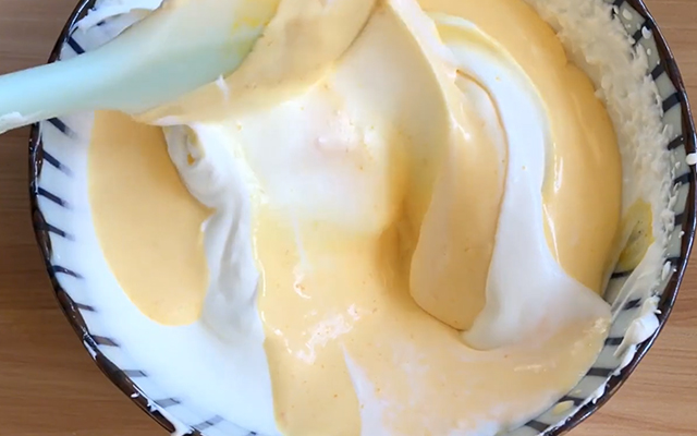 3、蛋黄液冷却后和打发好的淡奶油混合,不能使劲搅拌,只能慢慢的、轻轻的翻拌均匀