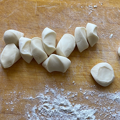 8、小剂子搓成长条,再分成小剂子,揉圆后按扁,擀成中间厚周围薄的饺子皮;