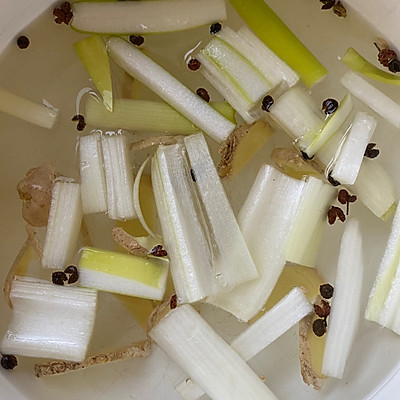 1、提前准备好葱姜水,(葱姜、花椒加入少许水煮开,盖上盖子焖十分钟晾凉备用),