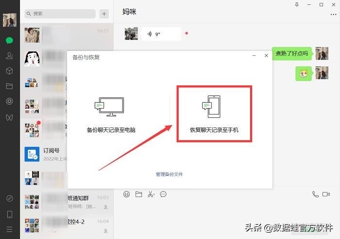 在弹出的备份与恢复聊天框中,点击【恢复聊天记录至手机】,并且根据手机上的提示进行确定,等待恢复成功。