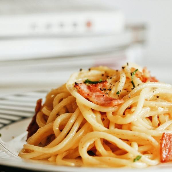 芝士培根意面,这道意面也有一点点腻,所以我们同样也需要一个杀过菌的生鸡蛋,将培根炒熟之后和意面混合,表面撒上芝士放入烤箱中烤三四分钟,出炉后加入一颗生鸡蛋,就可以食用了!