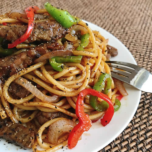 黑椒牛肉意面,牛肉要先煎一下,煎到七八分熟就可以,用黄油煎牛肉会更香一些,然后将牛肉和意面混合,撒上黑胡椒碎和罗勒叶,马上变成意大利风味。