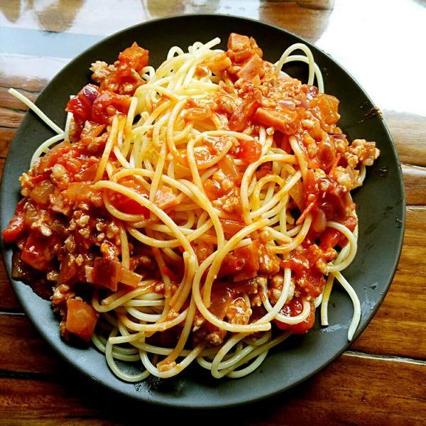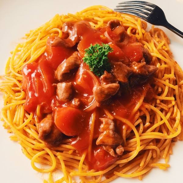 番茄肉酱意面,这种意面的精华在酱料,番茄最好选用小番茄,酸度更高一点,先将番茄炒出汁水之后再加入番茄酱,让其混合均匀之后再加入猪肉碎,等猪肉变熟之后加入意面翻炒,让意面充分入味。