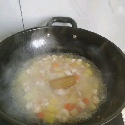 8、水开后小火炖,咖喱可以加水的时候放,也可以炖个一两分钟放,也不用刻意剁碎,煮会就会化了。
