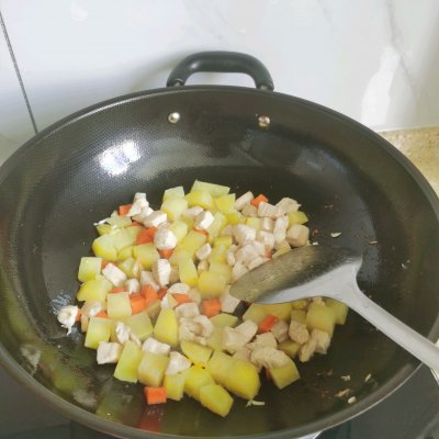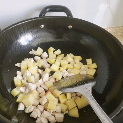 4、起油锅先下了鸡脯肉,喜欢这个过下油,牛肉丁一般不用生的,用熟牛肉,如果用熟牛肉一般先炒土豆丁了。