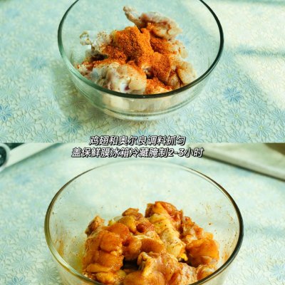 2、处理好的鸡翅根加入50克奥尔良腌料抓匀,冰箱冷藏腌制2-3小时。