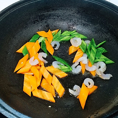 4、起锅烧油,放入虾仁,胡萝卜片,青椒片炒二分钟断生。