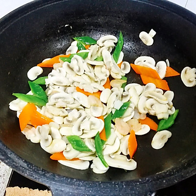 新鲜口蘑 200克 胡萝卜 半根 尖椒 半个 小虾仁 10个 料酒 2勺 糖 半勺 盐 1勺 耗油 1勺 鸡精 1勺 大蒜 3瓣