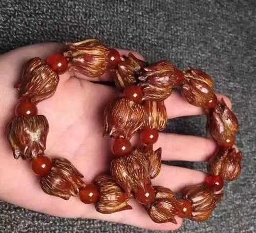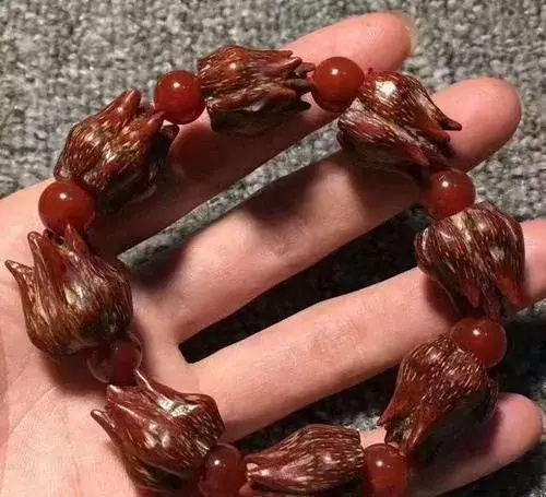 它被称为“滴血莲花”是因为它的颜色带红,经过把玩后,变成更为鲜艳的红,像血一样的红。滴血莲花多用来做法器的坠子,抵珠,穗头。体形大的可以拿在手里把玩,现在成串的也蛮多,不过它有点虐手…我个人不太喜欢成串。